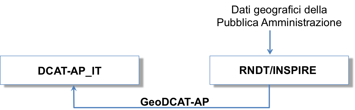 L’RNDT, in quanto banca dati di interesse nazionale ai sensi dell’articolo 60 del CAD e banca dati critica, è soggetta a regole di interoperabilità e gestione che prevedono, tra le altre, anche l’applicazione del principio “once only”. Secondo questo principio, i dati geografici sono documentati solo una volta e inclusi all’interno del catalogo RNDT, secondo le regole del profilo RNDT/INSPIRE (Figura 4). Sarà lo stesso catalogo, in maniera automatizzata, a fornire l’adeguata integrazione con i metadati descrittivi definiti mediante DCAT-AP_IT, grazie a una specifica estensione per il trattamento dei dati geografici detta GeoDCAT-AP che il Repertorio implementerà a tale scopo.