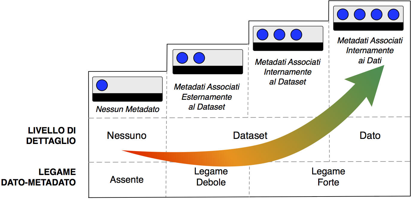 - Legame dato-metadato:: Il legame è forte perché i dati incorporano i metadati che li descrivono;