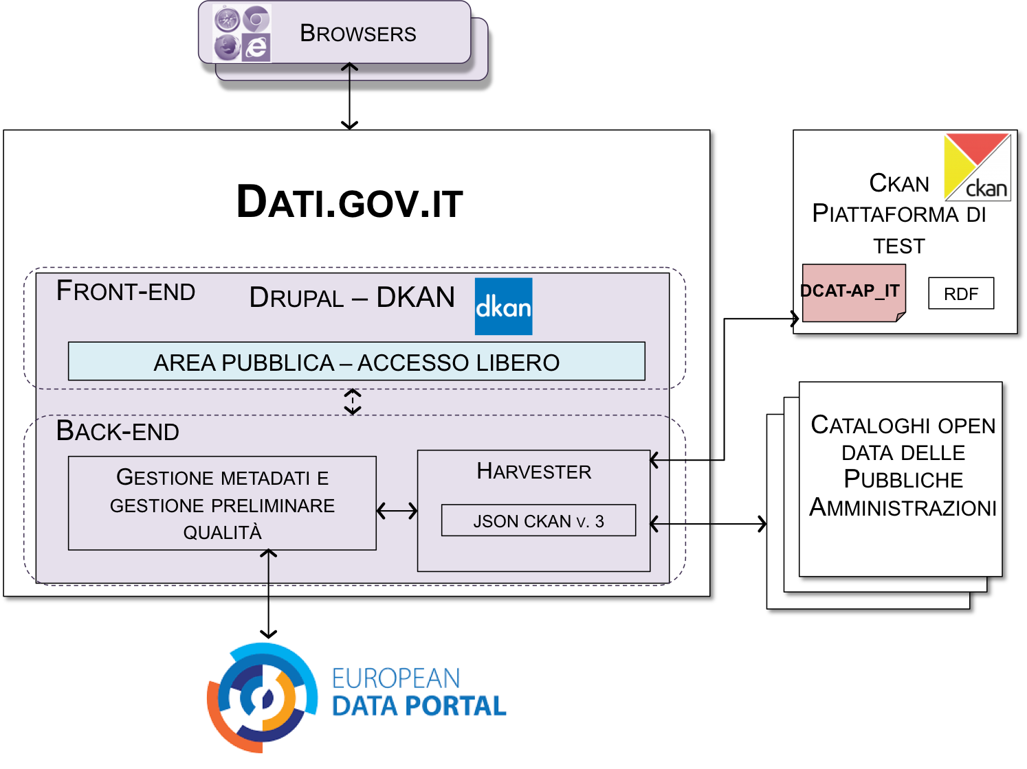 L’architettura complessiva dell’attuale portale nazionale dei dati aperti e il suo interfacciamento con analoghi cataloghi delle pubbliche amministrazioni e con il portale europeo sono illustrati in Figura 8.
