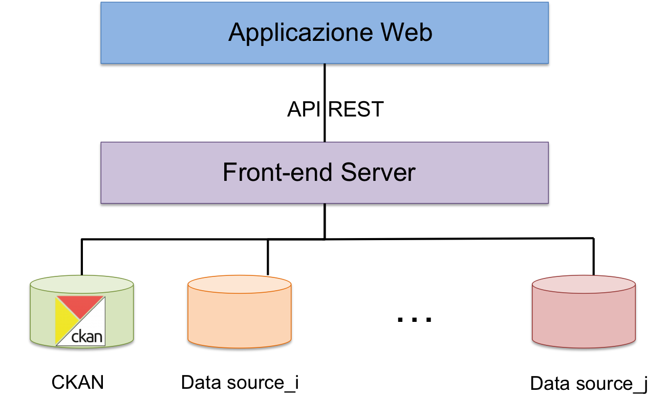 L’architettura complessiva del catalogo sarà diversa da quella attualmente disponibile. In particolare, l’architettura disaccoppierà la parte di front-end dalla parte di back-end, quest’ultima interamente gestita mediante la piattaforma CKAN e con metadati anche disponibili su SPARQL endpont, esattamente come accade per il portale europeo dei dati. I due livelli front-end e back-end interagiscono grazie a un livello intermedio chiamato front-end server. Per front-end server si intende un’applicazione che espone come unica vista una collezione di servizi RESTful con una rappresentazione dei contenuti di tipo JSON organizzati secondo una filosofia di tipo Resource Oriented Architecture (ROA).