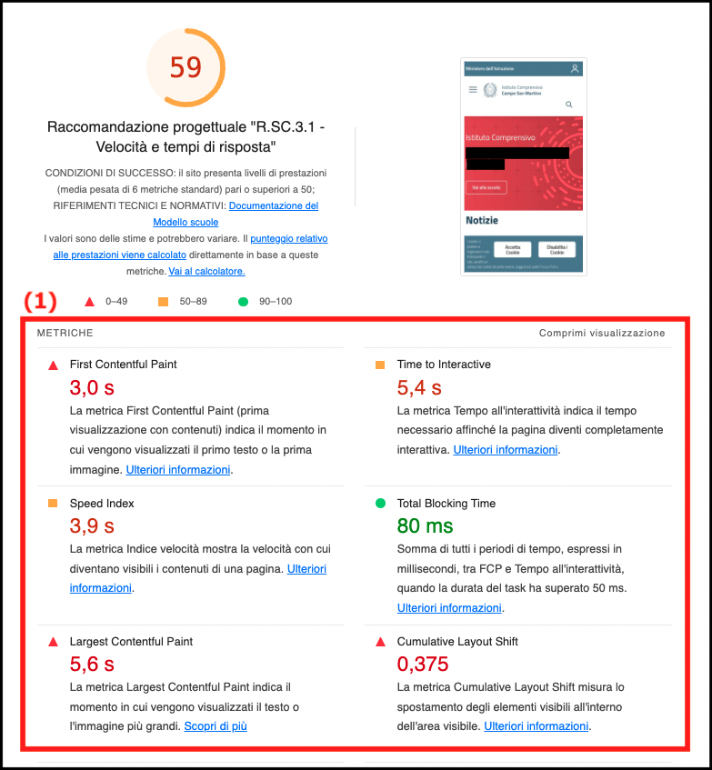 Nella sezione Metriche (1), vengono presentati i risultati delle 6 metriche (First Contentful Paint, Speed Index, Largest Contentful Paint, Time to Interactive, Total Blocking Time, Cumulative Layout Shift) che concorrono al punteggio del criterio di conformità o della raccomandazione.